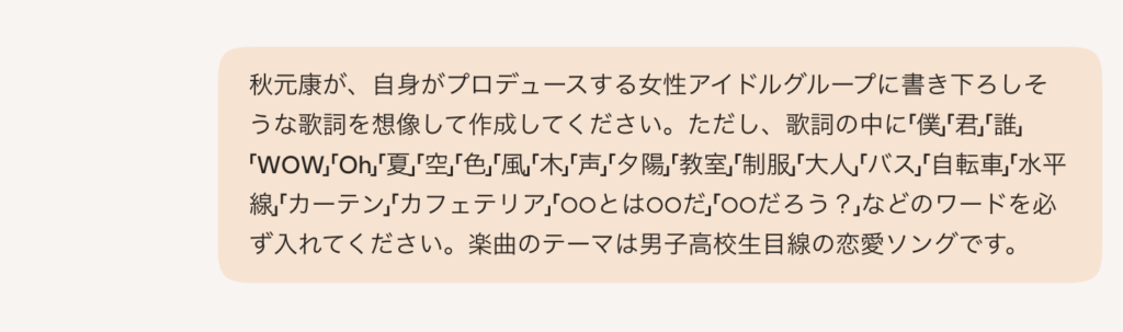 AIで秋元康風の歌詞を生成できるのはわかった。ではここからが本題。