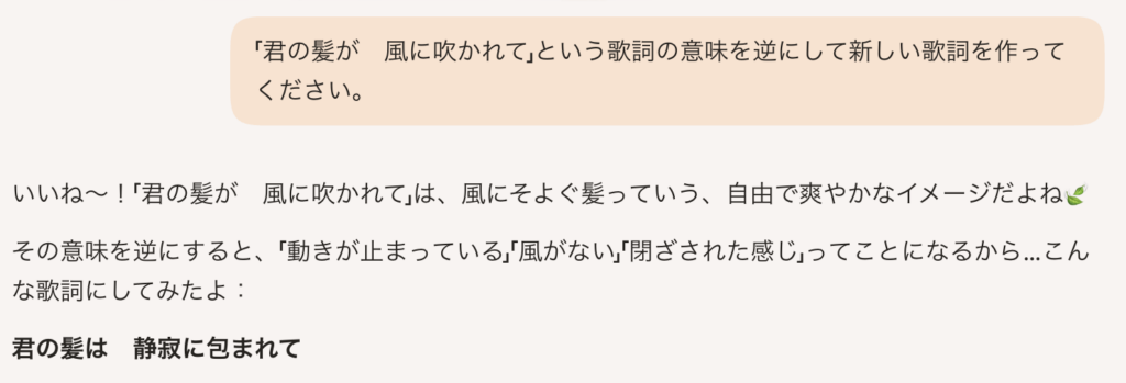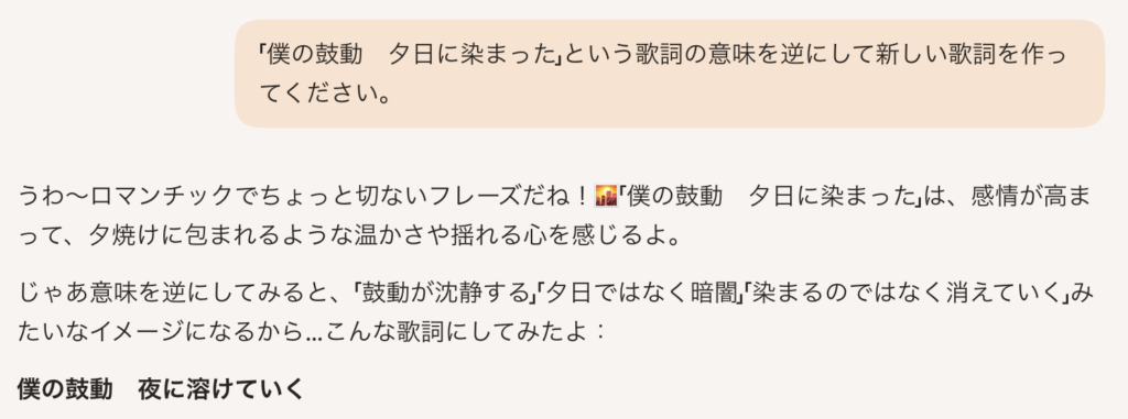 試しに適当にこのようなプロンプトで歌詞を出力してみる。先ほど挙げたクセとありがちな歌詞を盛り込んでみる。