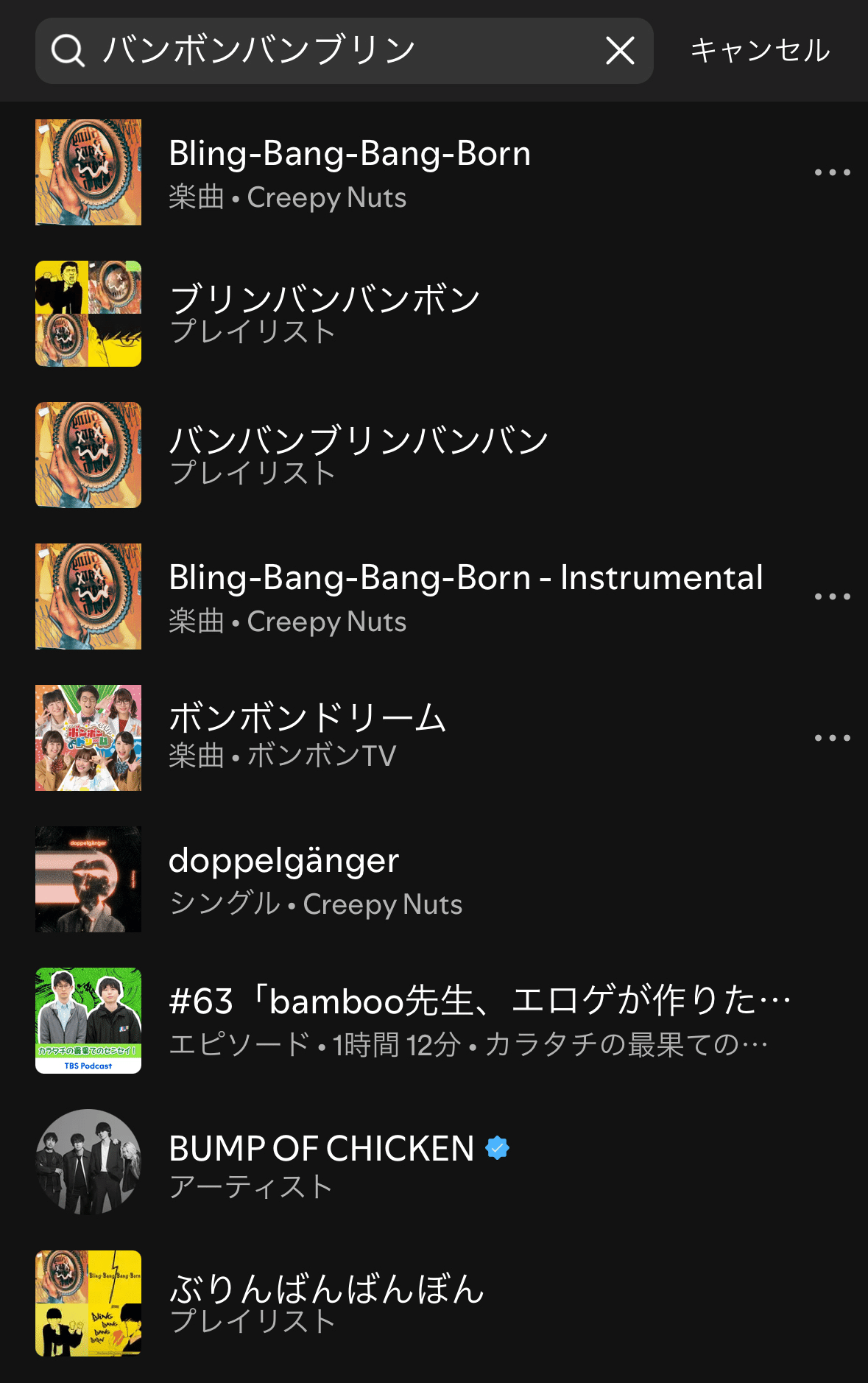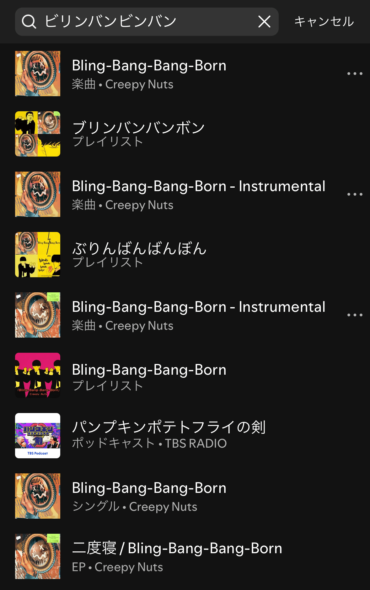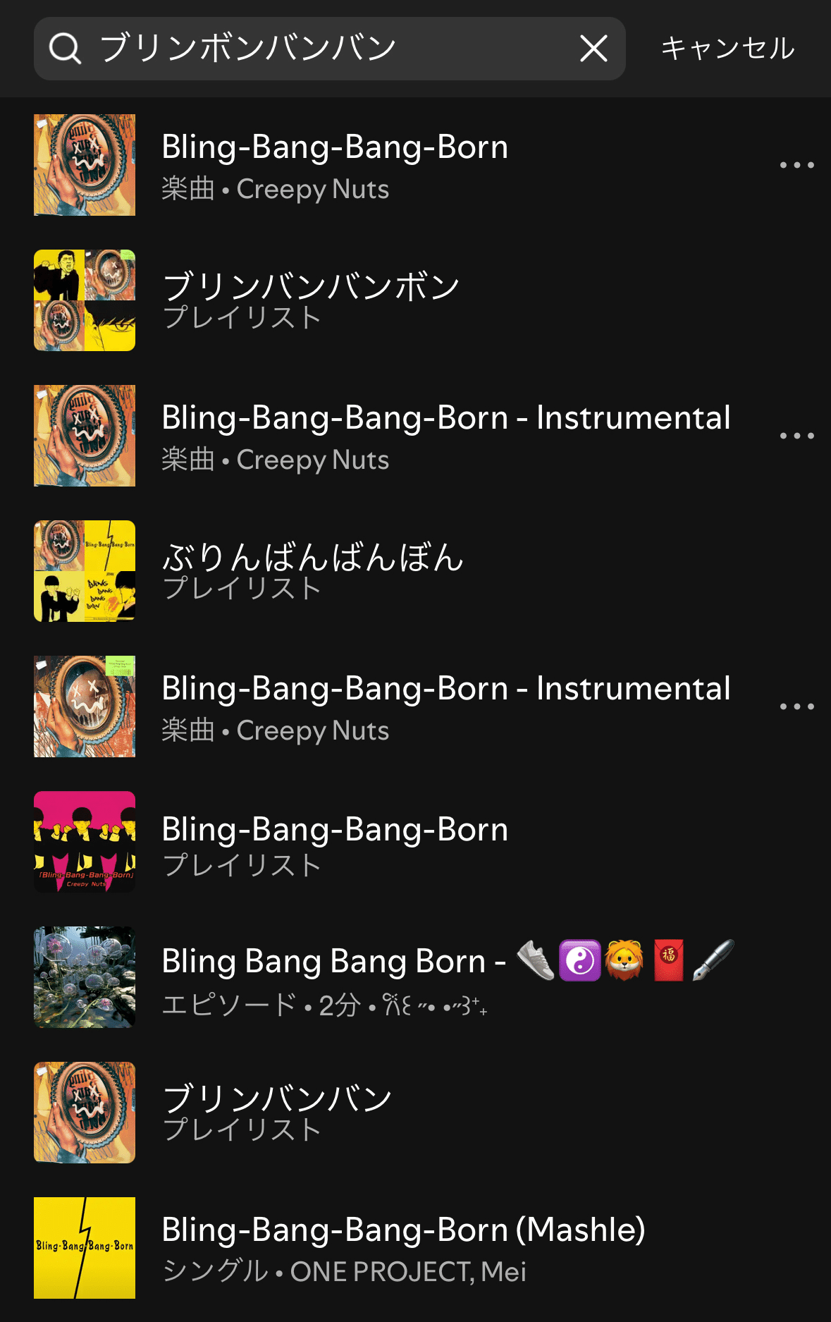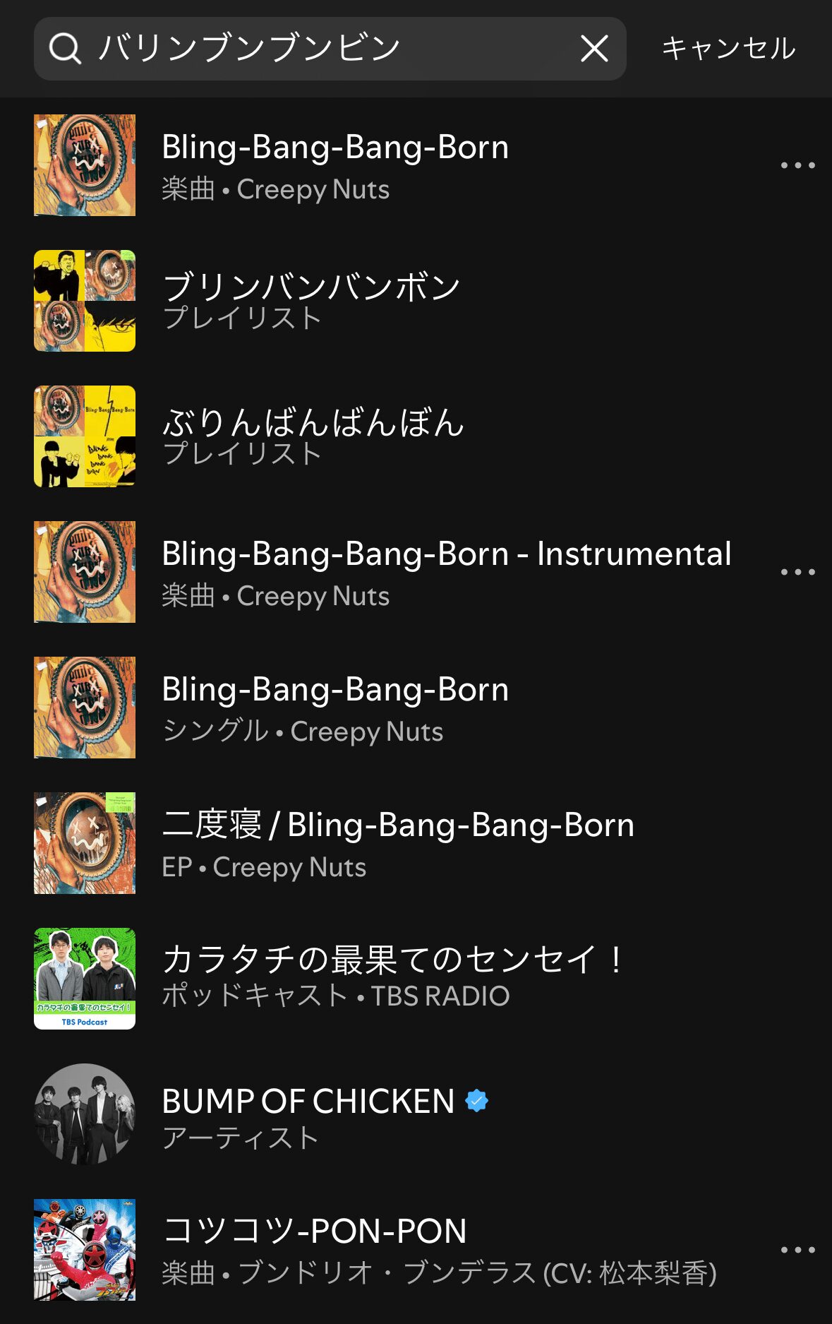 Spotifyの検索窓に「ブリンバンバンボン」と検索してみる。当然だが「Bling-Bang-Bang-Born」が出てくる。