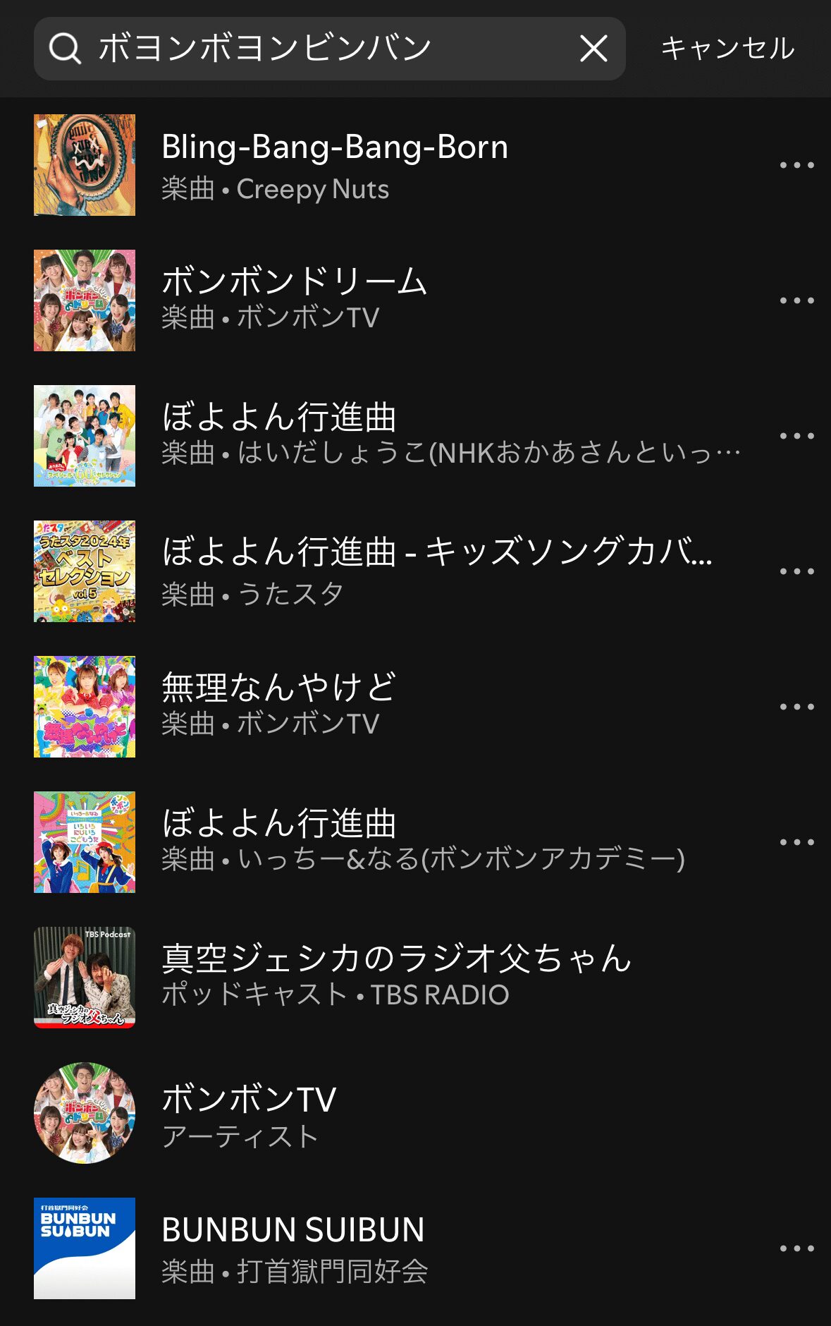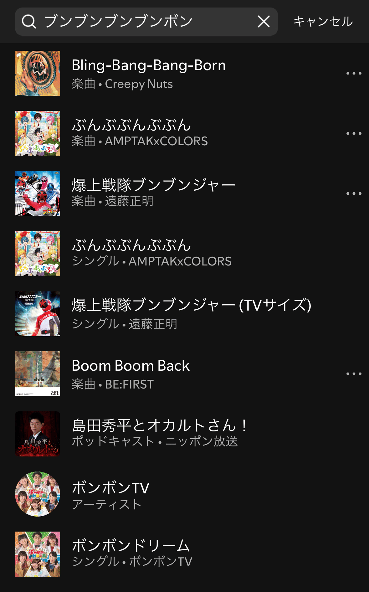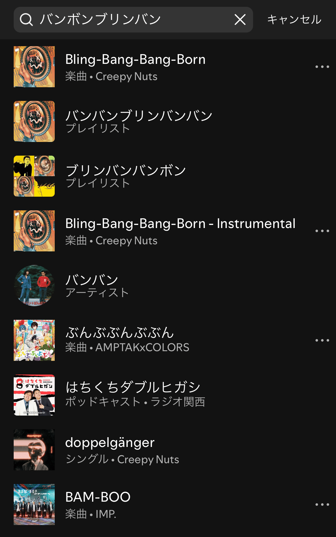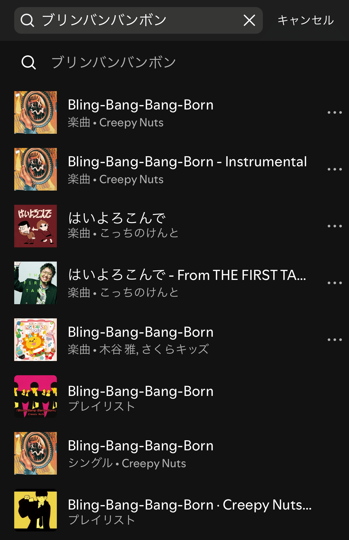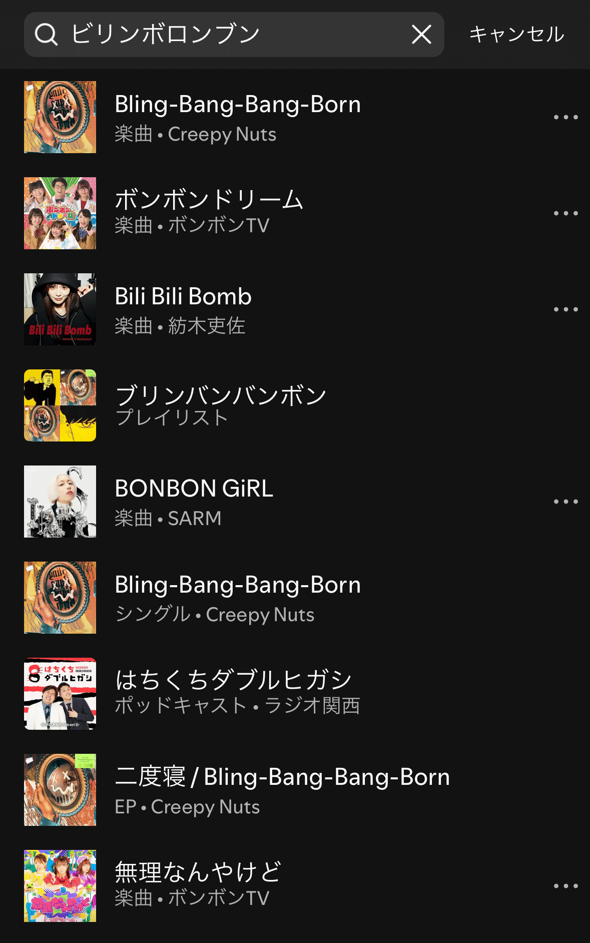 Spotifyの検索窓に「ブリンバンバンボン」と検索してみる。当然だが「Bling-Bang-Bang-Born」が出てくる。