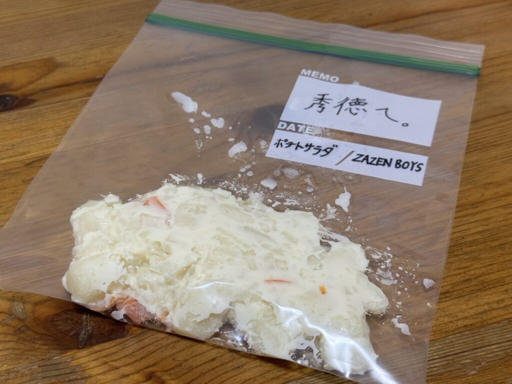 そんでもって、別にこの袋はちゃんとしたジップロックではないので正確には「ジップロックみたいなチャックのついたビニールの入れ物いっぱいのポテトサラダ」ということになる。きっと歌うときにはエミネムみたいな口になるだろう。