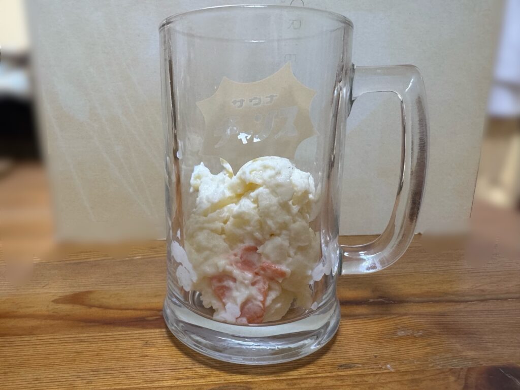 異質だ。まずポテサラでいっぱいじゃないのには目をつぶってもらうが、かなりありえない光景だと思う。これにウイスキーか純米酒を注いでもらったら一石二鳥。